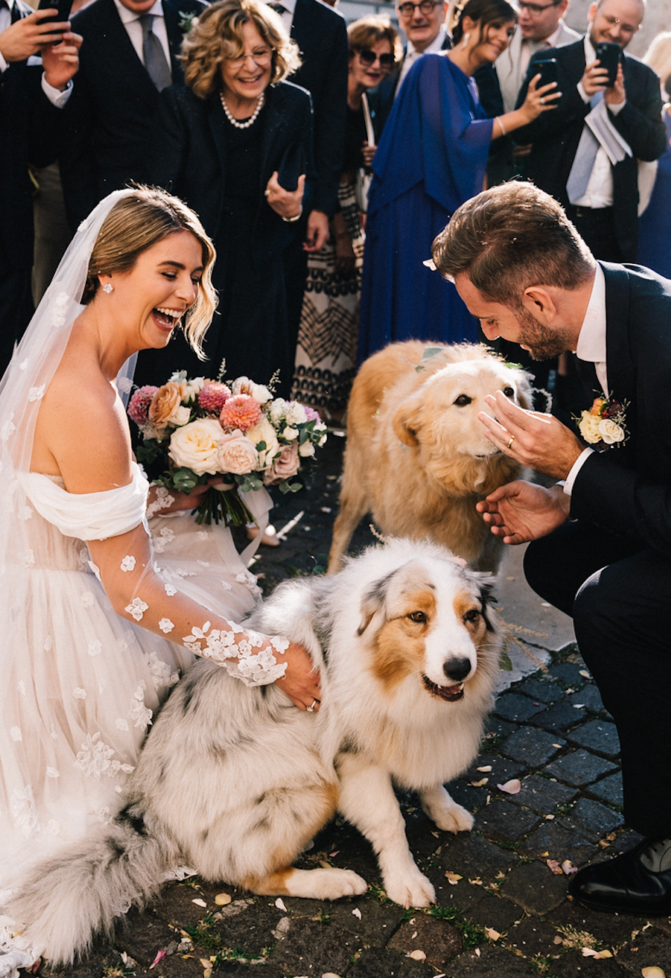 I immediately fell in love with the Meeka Diana set and I could not kick off the day without it! I then decided to gift my bridesmaids and family girls respectively with Bella Lounge sets and Camillo robes: I loved how they stayed true to our colour palette! During the ceremony and the first half of the reception, I wore a custom-made bridal dress designed and made by Francesca Piccini, an Italian excellence for bridal and occasion dresses, paired with a pair of pumps in nude colour. I wanted a dress that could best represent me and the place where I was getting married, which resulted into a romantic, stylish and unique dress, made with love. I then opted for a glamorous sequin mini-dress by Francesca Piccini, paired with Amina Muaddi Gilda sandals and headband by Lelet NY for the post-dinner party. Earrings from Leo Pizzo enriched both outfits. Valerio wore a blue-navy tuxedo designed by Tagliatore, an artisanal Apulian tailor since 1972, paired with a matching tie for the ceremony and a bowtie for the party. Of course, shoes had to be Church’s. Last but not least, our dogs wore a bespoke flower collar designed by our florist.